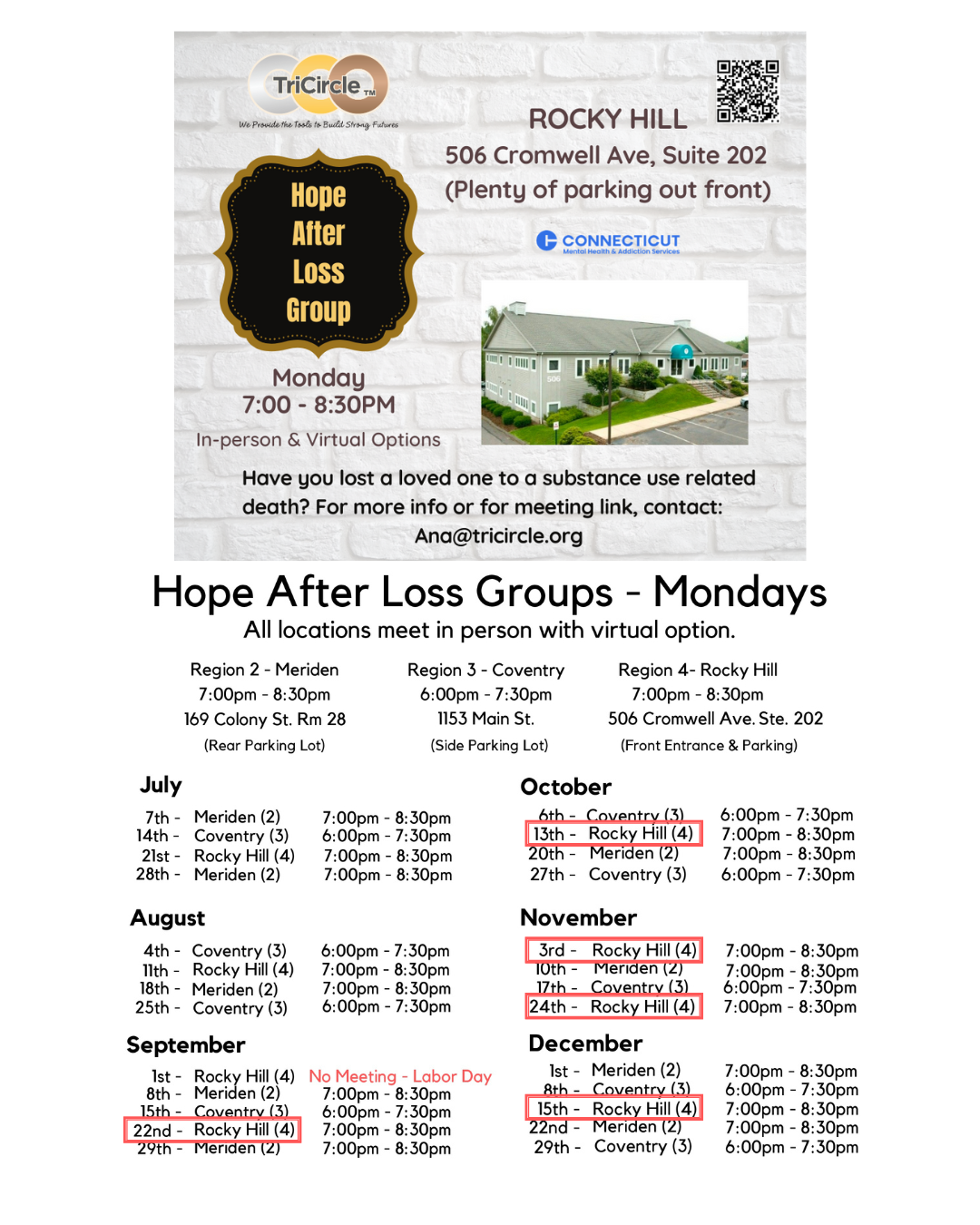 Tricircle provides resources for those affected by the disease of addiction. Support groups for: those living with a loved one experiencing substance use disorder (SUD) & those who have lost a loved one to SUD.