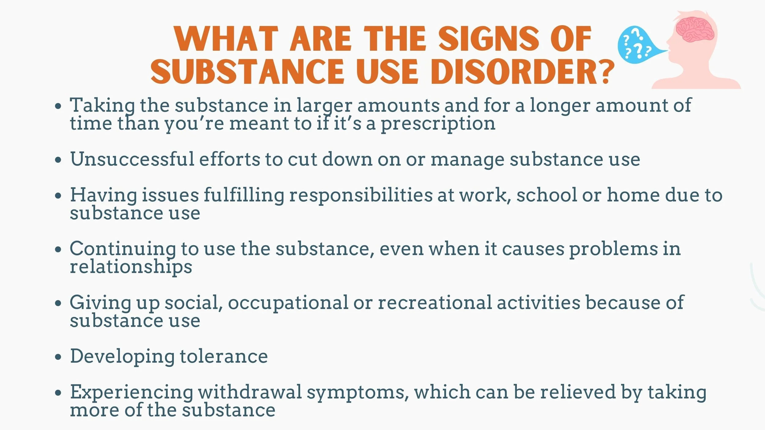 People with a substance use disorder may have distorted thinking and behaviors. Changes in the brain's structure and function are what cause people to have intense cravings, changes in personality, abnormal movements, and other behaviors. Brain imaging studies show changes in the areas of the brain that relate to judgment, decision making, learning, memory, and behavioral control.